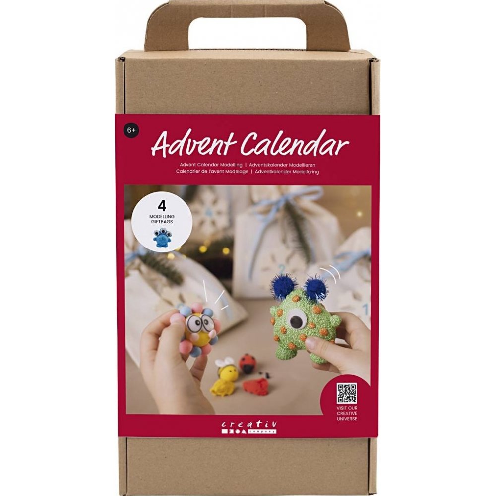 Adventskalender for kreative børn med nyt modelprojekt hver søndag i advent. Den indeholder alle de materialer og instruktioner, du har brug for. Gør ventetiden til jul lidt sjovere med vores kreative adventskalender. Kalenderen indeholder fire gaveposer, en til hver søndag i advent, og hver pose indeholder et nyt modelprojekt. Selvom indholdet er en overraskelse, garanterer vi masser af sjov leg med både Silk Clay® og Foam Clay®. For børn og voksne er adventskalendere og julekalendere noget af det bedste ved julen. Det skaber forventning i december og de fleste elsker glæden ved de små overraskelser, der venter én. En julekalender er en påmindelse om, at julen nærmer sig, og en adventskalender er med til at gøre hver søndag i advent ekstra speciel. Indhold: 4 stofposer, Silk Clay®, Foam Clay®, blyanter, bevægelige øjne, sejlgarn, styrofoam figurer, pap, magneter, nøglering og store øjne.