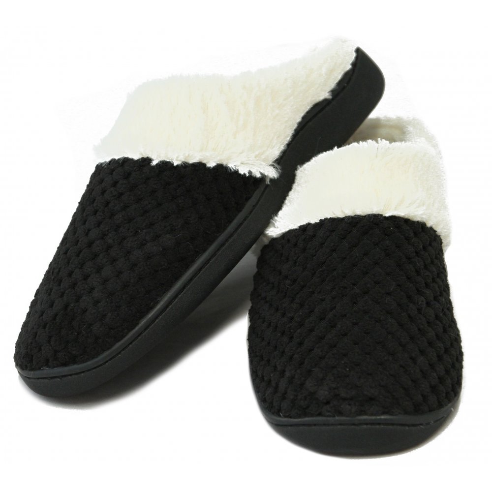 Sorte dametøfler med blød hvid akrylpels på indersiden og gummisål.