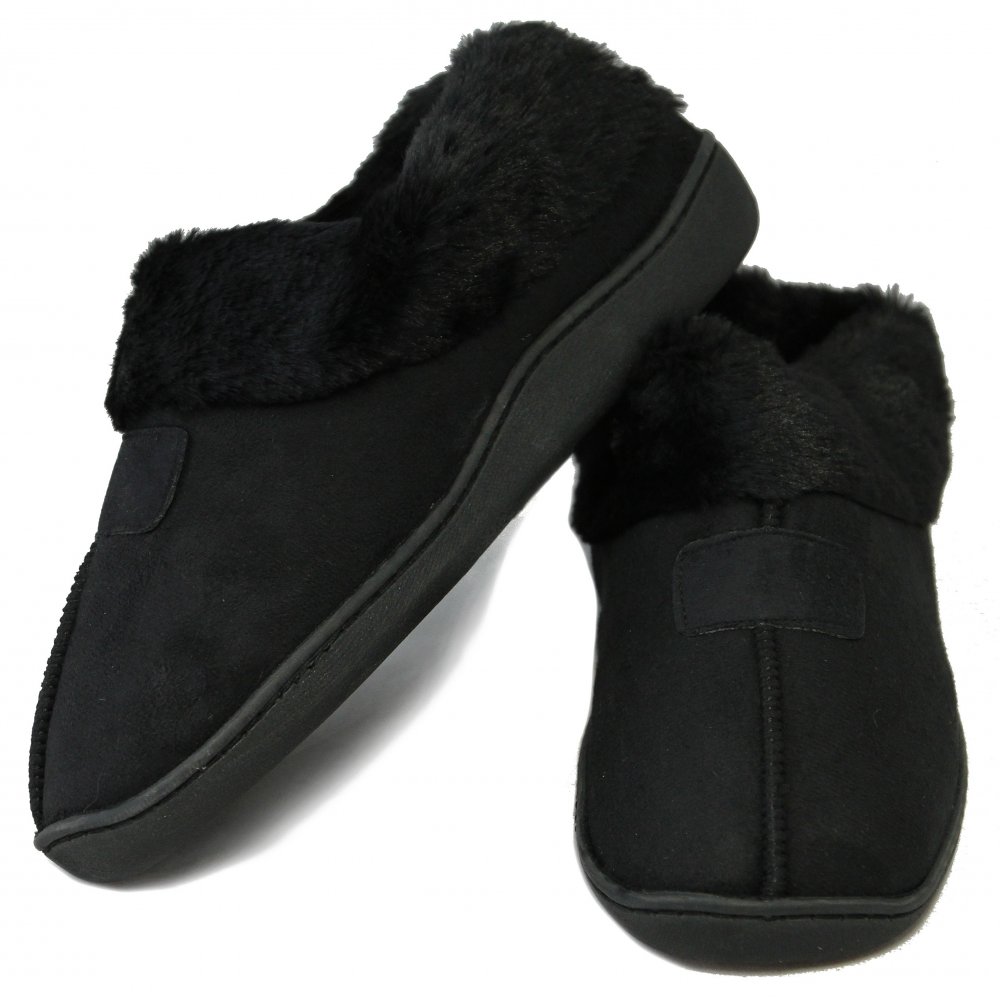Gode kvalitets indendørs hjemmesko med varmt akrylfor. Sorte indendørs hjemmesko i imiteret ruskind og imiteret pels til både kvinder og mænd med et varmt inderfor med en bred pelskant.