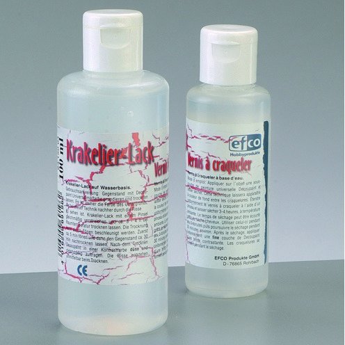 Grund med Decoupaint og lad overfladen tørre. Den knitrende lak vil lade overfladefarven skinne igennem. Mal over et lag krakeleringslak og lad tørre i 3-4 timer ved stuetemperatur. Du kan fremskynde tørringen ved at blæse med en hårtørrer. Blæs med hårtørreren i cirka 5 minutter og lad lakken ånde i cirka 30 minutter. Når lakken er tør, kan du påføre et jævnt lag Decoupaint i en kontrastfarve. Den krakelerende effekt vil være synlig, så snart malingen begynder at tørre. Denne effekt er perfekt til f.eks. decoupage på servietter. BEMÆRK. Grund med en mørk tone og når lakken er tørret, brug en lysere til at fremhæve serviettens motiv.