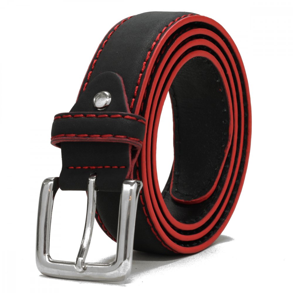 Stilfuldt læderbælte med røde syninger, der giver en diskret kontrast til det glatte læder og kromdetaljerne.
