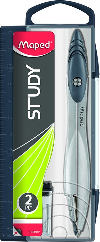 Grå pas i metal og plastik. Adapteren er til stifter og i pakken er der også en ekstra stift. Plastetuit har også en indgraveret lineal på langsiden.