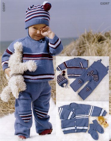 Strikkeopskrift - Stribet raglantrøje, striktrøje, bukser, hue, vanter og sokker