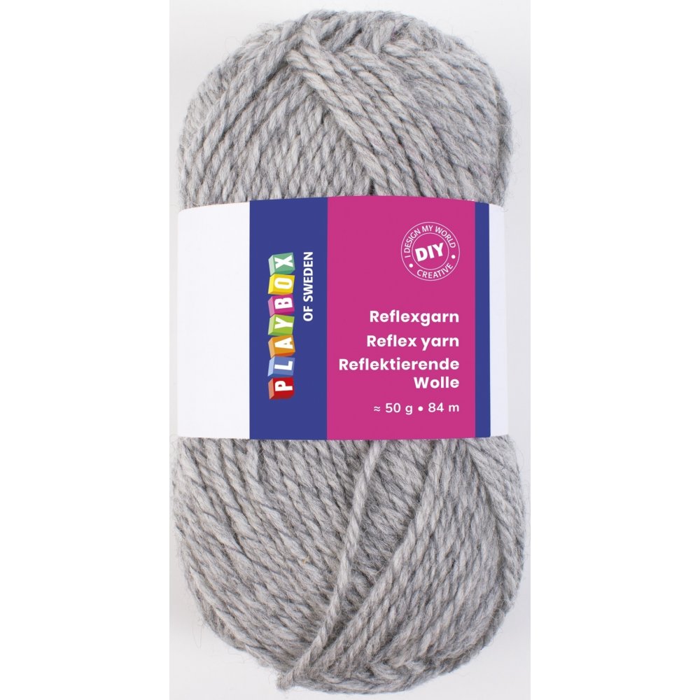 Lysegråt garn med reflekterende tråd. Strik eller hækl en hue, pandebånd eller tørklæde eller lav en pompon og sæt den på tasken. En kreativ og sjov måde at sikre, at du bliver set i mørket. Brug det du skaber af garnet som et supplement til en almindelig refleks.