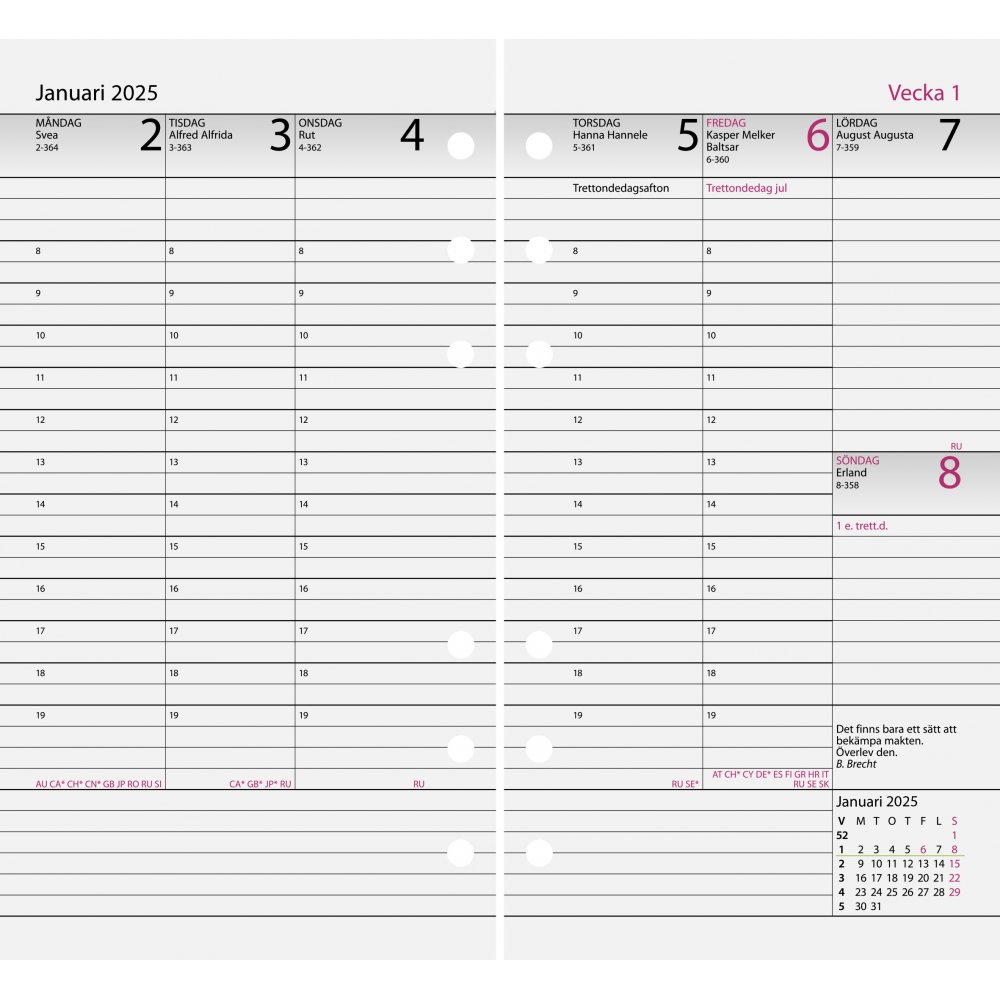 Aplan Diary Manager refill på 9,2 x 16,8 cm som er perforeret til ringmekanisme. Den indeholder 1 uge pr opslag i 18 måneder.